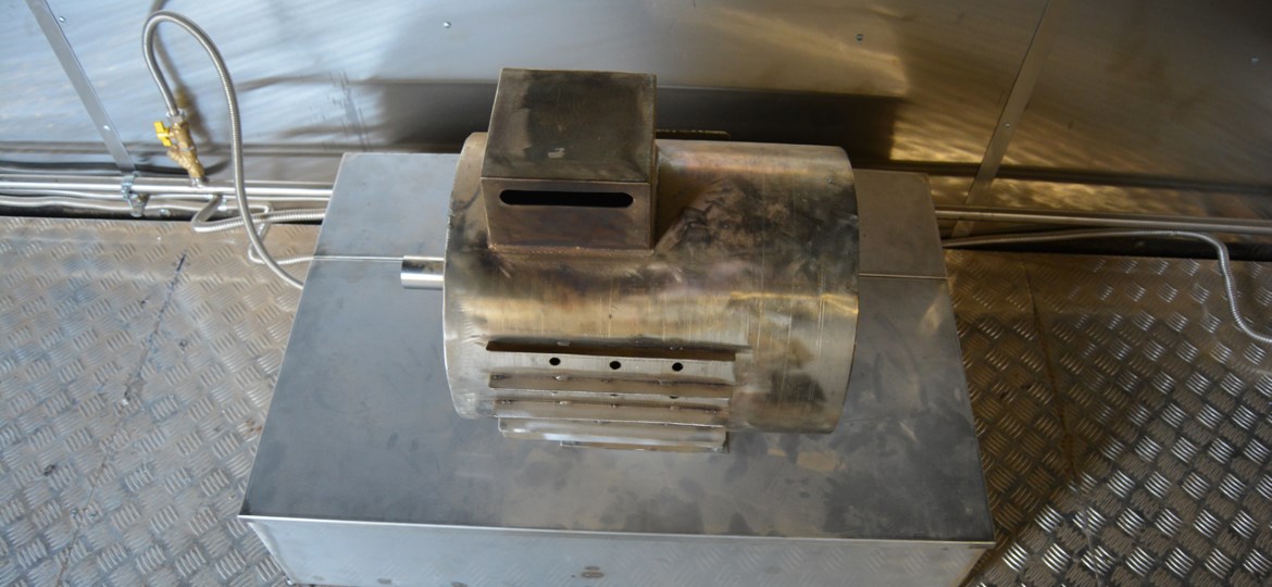 Огневой тренажер-симулятор «Горящий электродвигатель» представляет собой подставку, на которой установлен макет корпуса электродвигателя, внутри которого размещены газовые горелки, в подставке расположен блок управления тренажером. Напряжение электропитания блока управления тренажером 24В